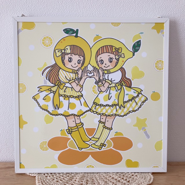 2022年「キイロ展」にて展示した、作品パネル「メンカラ」になります。 ※正式タイトル「メンバーカラーはゆずイエローとレモンイエローです♡」 白のアルミフレームと、吊り下げヒモ付きです。 作品裏には、展示の際に出来た若干の紙浮きがございます。 1枚目:パネル画像 2枚目:作品裏 3枚目:アルミフレームと吊り下げヒモ 4枚目:キャプション 5枚目:イラストデータサンプル サイズ:30×30㎝ パネルの厚み:約10mm(アルミフレーム込) 材質:発泡パネル・光沢紙 その他:アルミフレーム・吊り下げヒモ付き おまけ:当時の作品キャプション