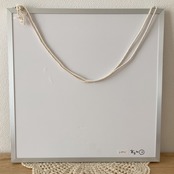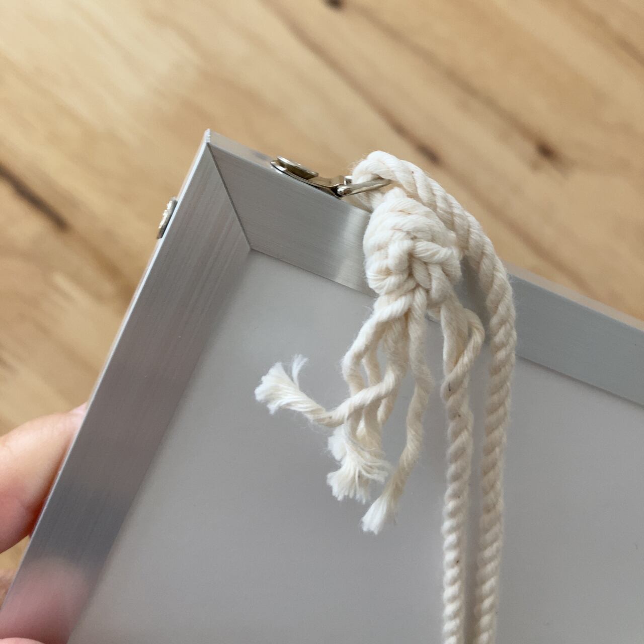 シルバーのアルミフレームと、吊り下げヒモ付きです。
