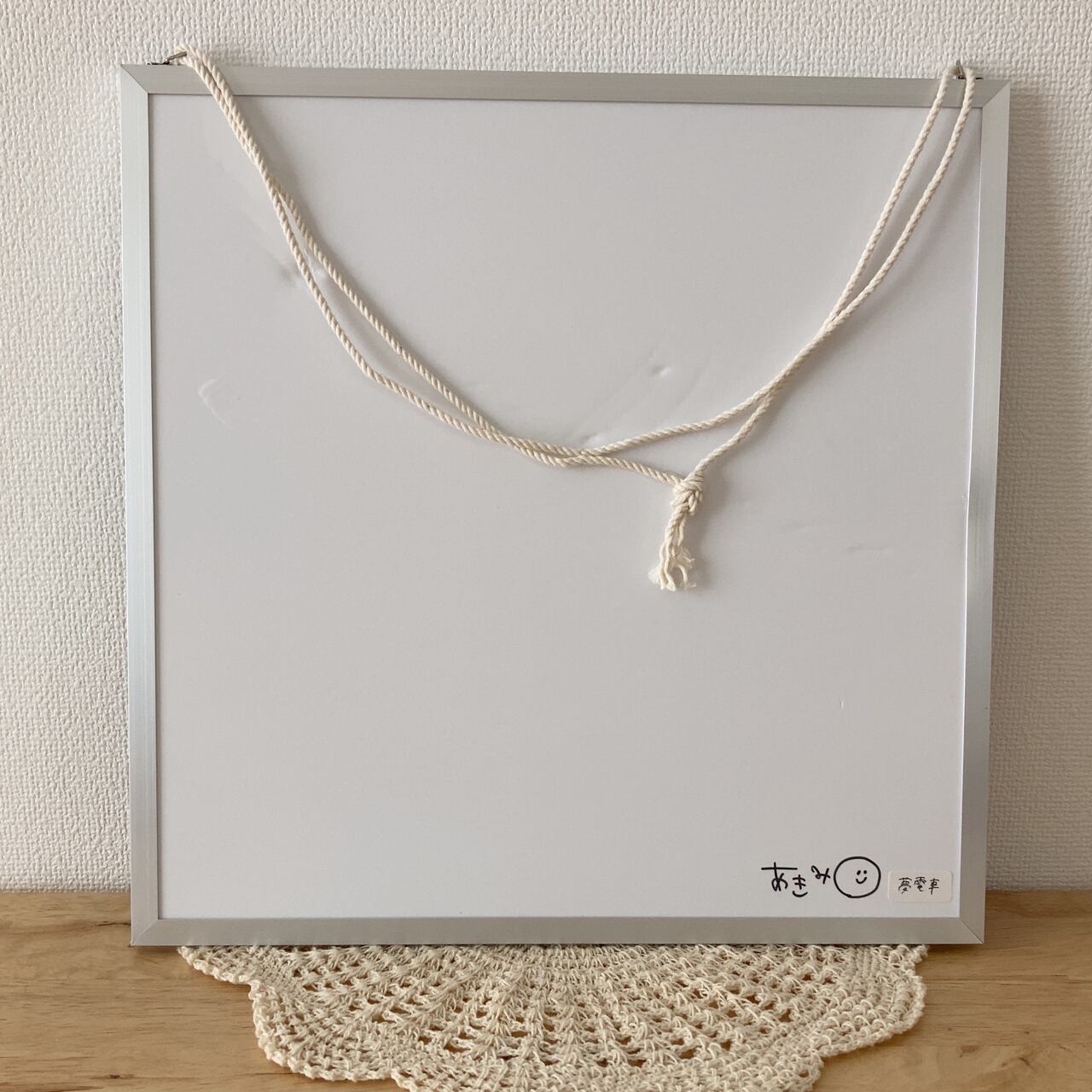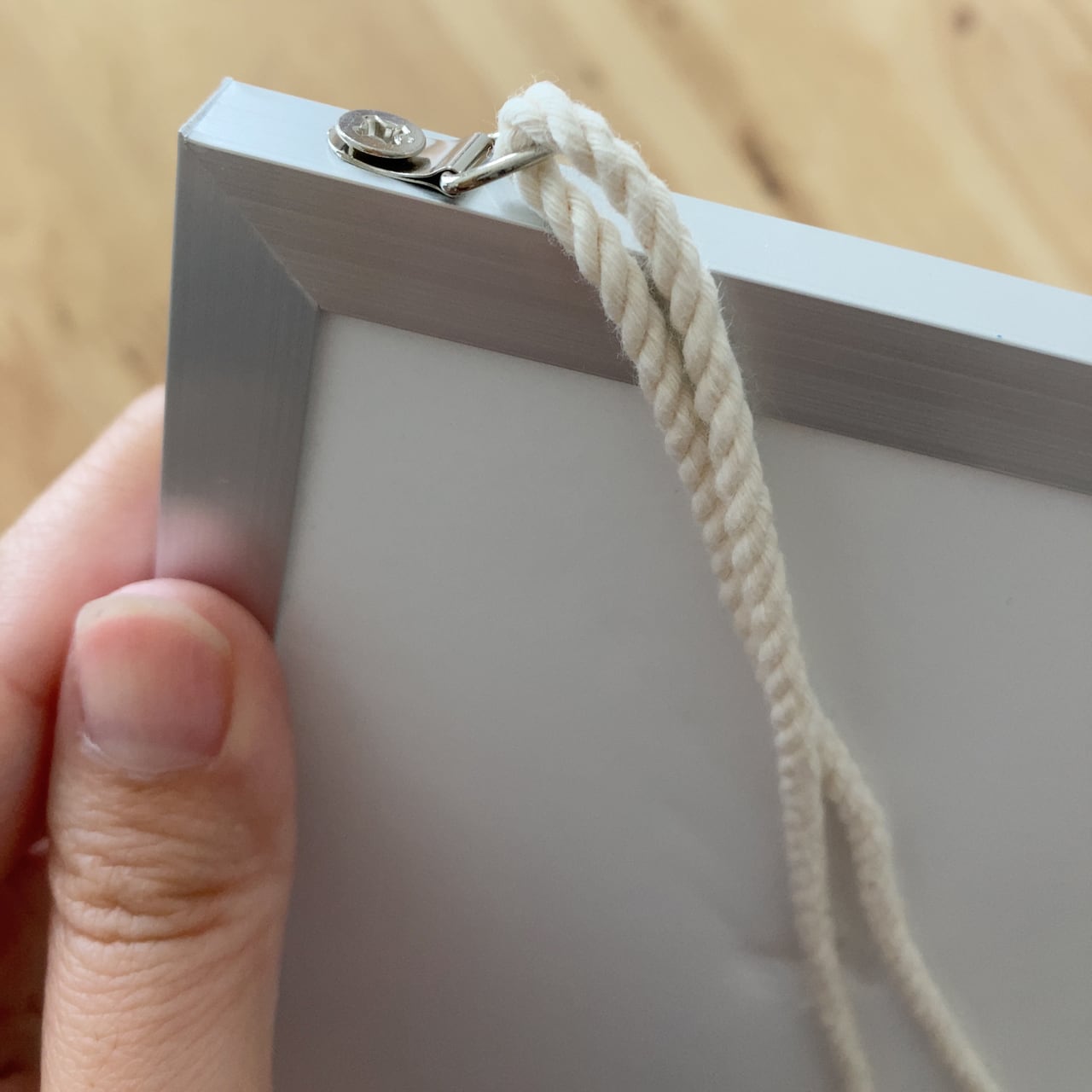 シルバーのアルミフレームと吊り下げヒモ付きです。